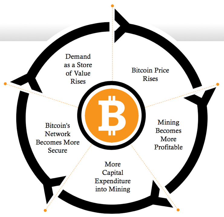 Bitcoin is also the world’s first asset with perfect supply inelasticity, as changes in its price have absolutely no impact on its supply flow. This means changes in demand for Bitcoin can only be expressed in its market price. If the price of gold increases, its new supply flow will increase as new miners enter the market and new methods of gold mining becoming economically feasible (since the gold miners can sell their product at a higher price), thereby applying downward pressure to its stock-to-flow ratio. With Bitcoin, no matter how much its price increases, it is absolutely impossible to create any new supply flow beyond its mathematically enforced and universally transparent issuance schedule. Also, a higher market price means a more secure Bitcoin network, as the resources allocated to mining are used to secure it. Like a vault with walls that thicken as more value is stored within it, Bitcoin adapts to become a more secure monetary network as its market capitalization grows. Absolute obstinance of the algorithmically enforced Bitcoin monetary policy drives a virtuous cycle that perpetuates the expansion of its network: