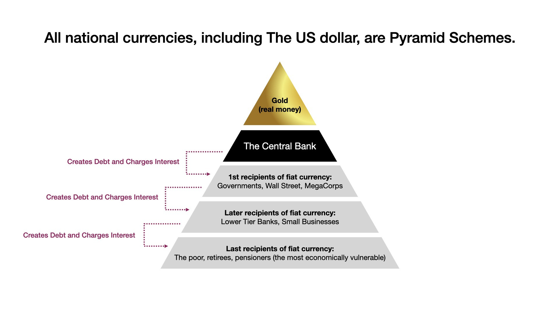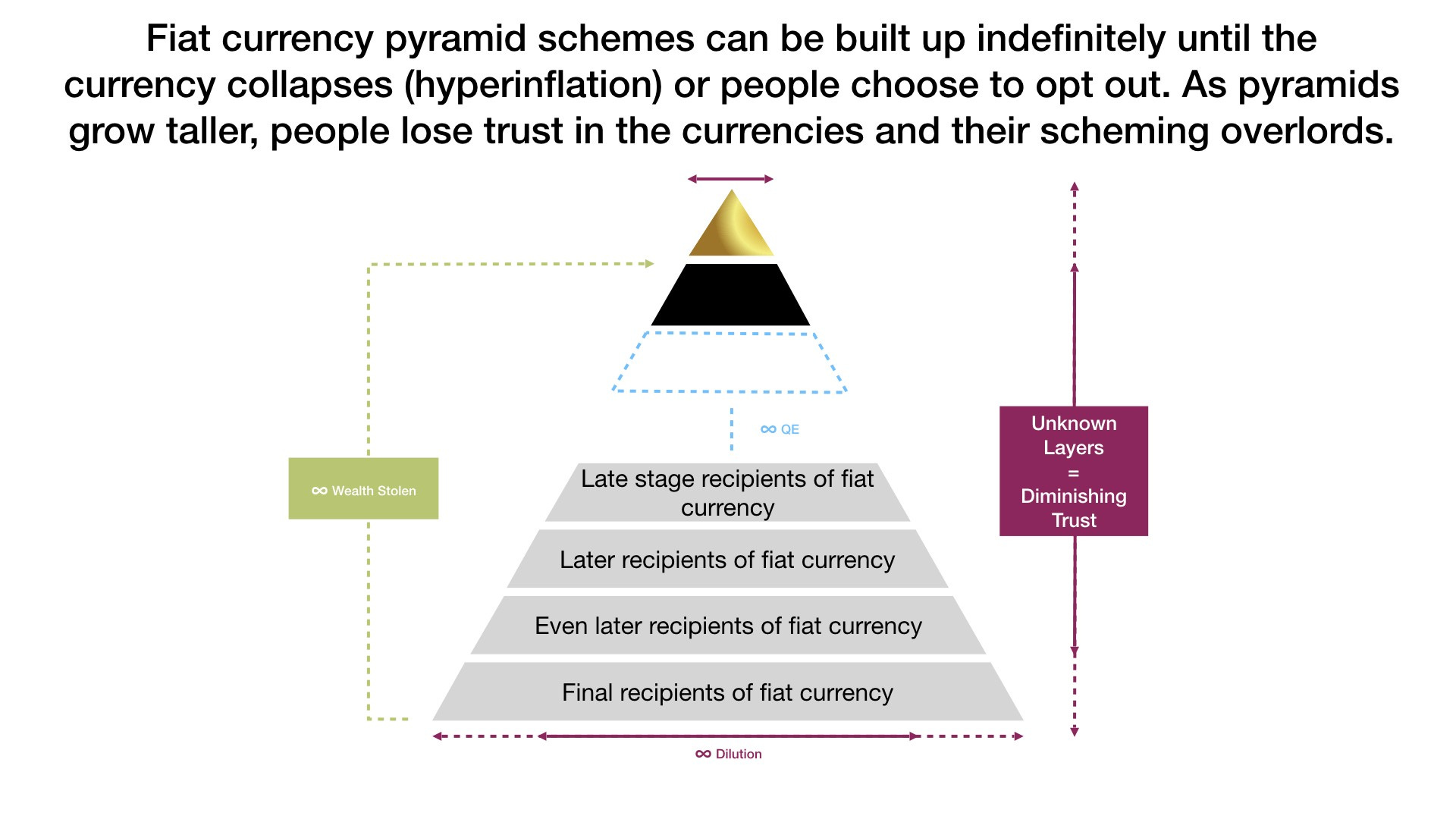 At the pinnacle fiat currency pyramid schemes is gold: a technology selected as money by the cumulative free choice (the collective logos) of countless entrepreneurs throughout history. Paper currency abstractions of gold were introduced purely to make it more convenient for exchange, not to replace it. Over time, the option to redeem currency for gold was eliminated, giving governments full control over currency scarcity, and therefore an unlimited capacity to confiscate wealth from their citizens by compromising its supply.